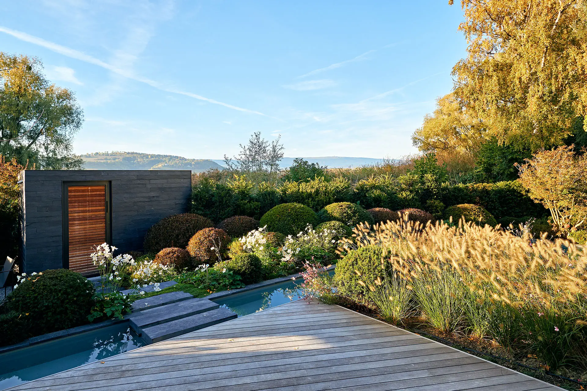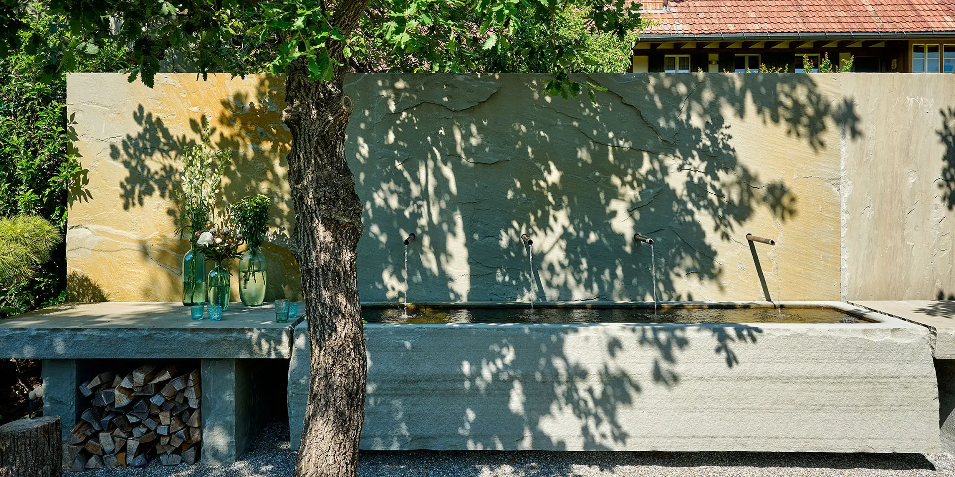 Im Garten lässt sich Wasser in unzähligen Variationen einsetzen, um eine ganz besondere Atmosphäre zu kreieren: Ein imposanter individueller Gartenbrunnen aus Kalkstein zaubert südliches Flair direkt zu Ihnen nach Hause und wird zum Herzstück des grosszügigen Sitzplatzes. Ein Bachlauf, der den Aussenbereich durchzieht, verleiht dem Garten Leben und Struktur, während der strahlend blaue Pool zum Schwimmen verführt.