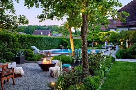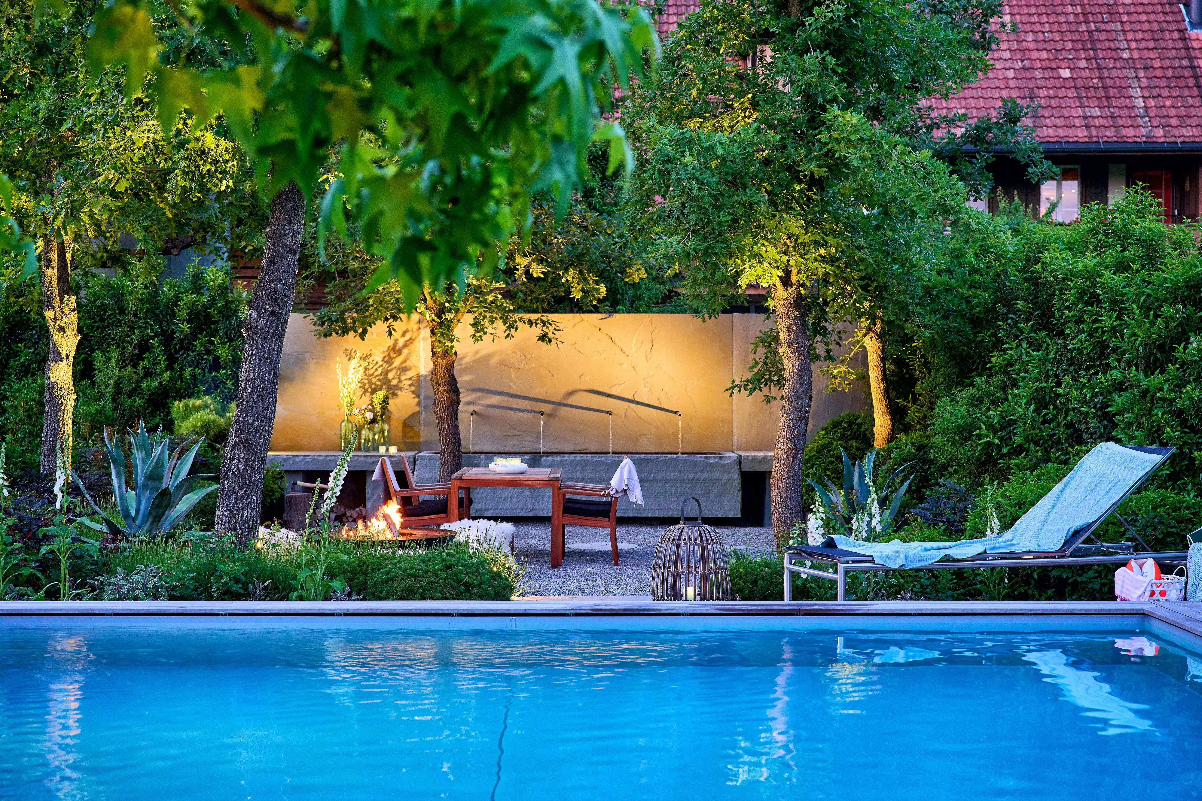 Leicht abgesenkt vom restlichen Garten ist ein lauschiger Ort entstanden, der zum Beisammensein von Familie und Freunden bestimmt ist. Fünf knorrige Flaumeichen lassen eine mediterrane Stimmung aufkommen. Leise streicht der Wind durch die Baumkronen. Das lockere Blattwerk zeichnet ein wechselndes Schattenspiel auf den hellen Kiesboden. Jeder der neu gepflanzten Solitäre wurde in der Baumschule individuell für seinen spezifischen Standort im Eichenhain ausgesucht. Zwei Stufen höher ist Wasser das Thema: Ein quadratischer Pool lädt türkis glitzernd zum Baden und Ruhen ein. Seine Proportionen sind exakt auf die Geometrie des Landhauses abgestimmt.