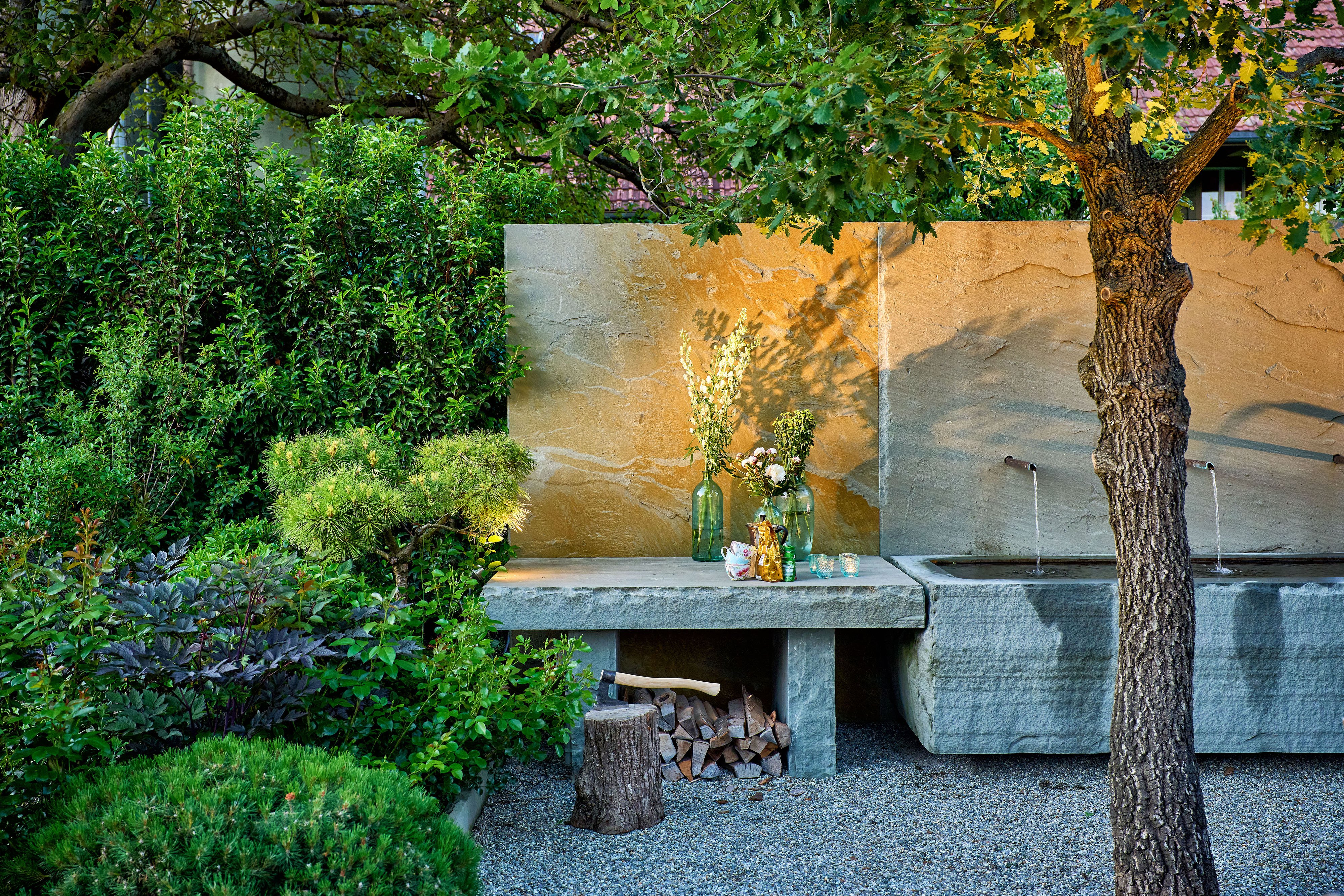 Hohe, vertikal gestellte Sandsteinplatten schliessen das Gartenzimmer zum Nachbarsgrundstück hin ab. Davor steht ein langgezogener Brunnen, ebenfalls aus Sandstein. Er ist ein über drei Meter langes Unikat, eigens für den Garten der Familie K. gefertigt. Aus mehreren Messingrohren plätschert das Wasser, löst meditative Ruhe aus und generiert ein Gefühl des «Angekommen-Seins».