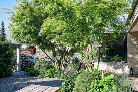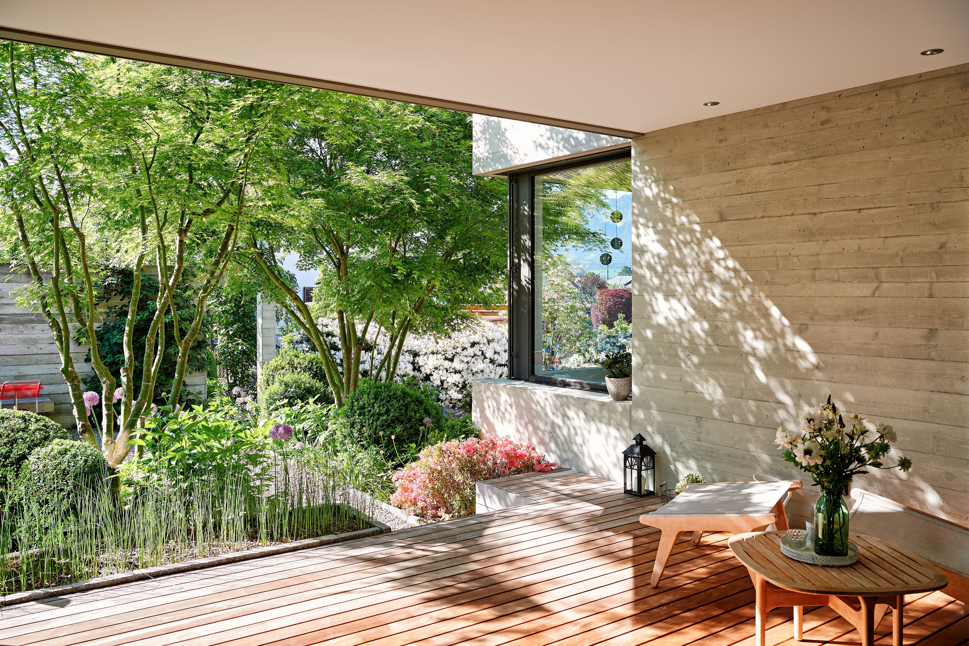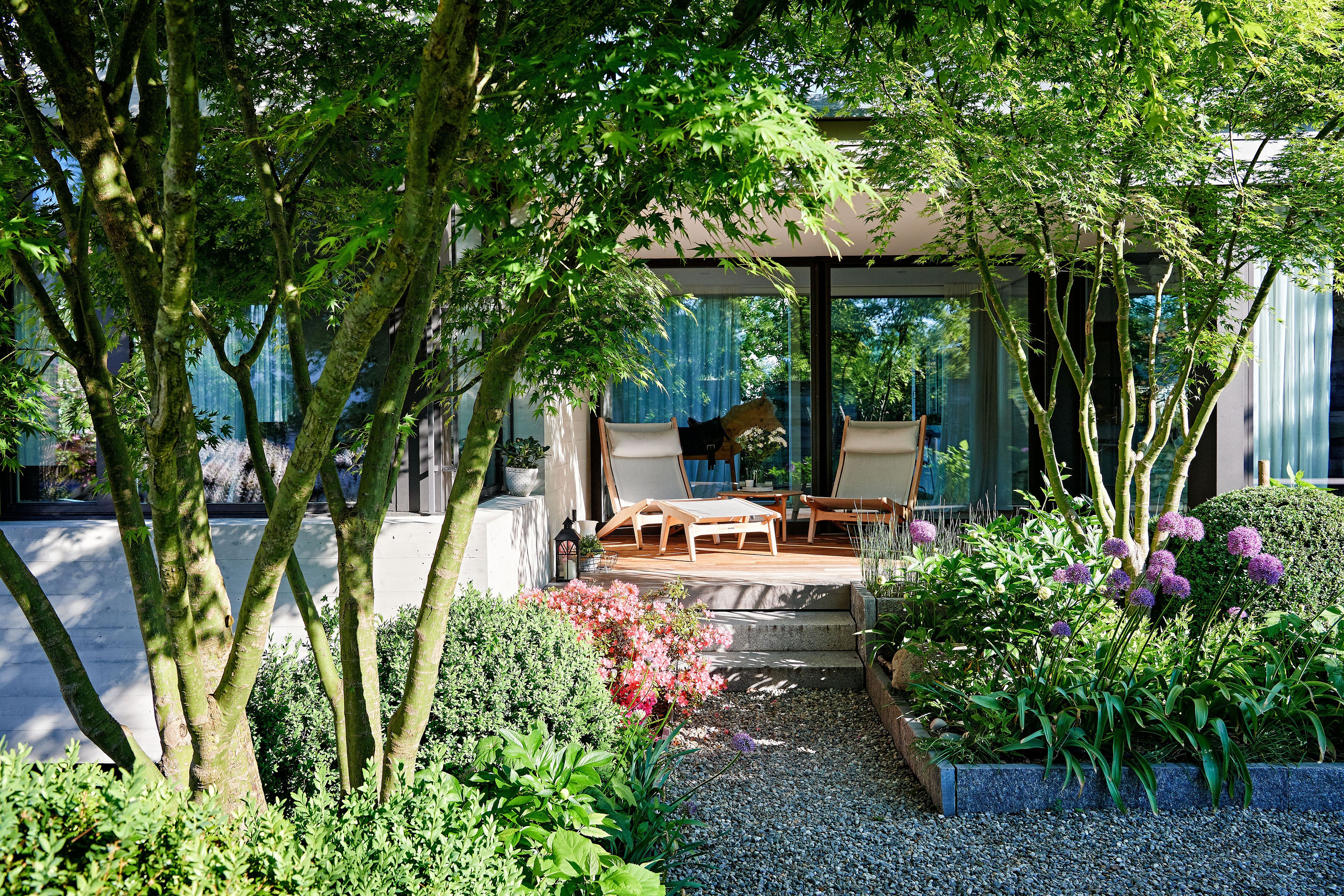 Dass die verschiedenen Gartenteile etappenweise über neun Jahre entstanden sind, würde man nicht vermuten, so sehr sieht alles aus wie aus einem Guss. In der Verlängerung von Schlaf- und Esszimmer bieten verschiedene Holzdecks Aufenthaltsflächen, von denen aus der Blick über Rabatten mit Buchs, Hortensien und Zierlauch fällt. Fünf mehrstämmige Ahornbäume rhythmisieren den Raum, der durch freistehende, mit Kletterhortensien bewachsene Betonmauern wie ein Innenhof gefasst ist. Im Hebst bilden die gelben Blätter der Hortensie und das rotorange des Ahorns ein buntes Duett. Das leise Plätschern des Brunnens und das Zwitschern der Vögel bereichern die Sinne und lassen vergessen, dass es unweit überhaupt Nachbarhäuser gibt.