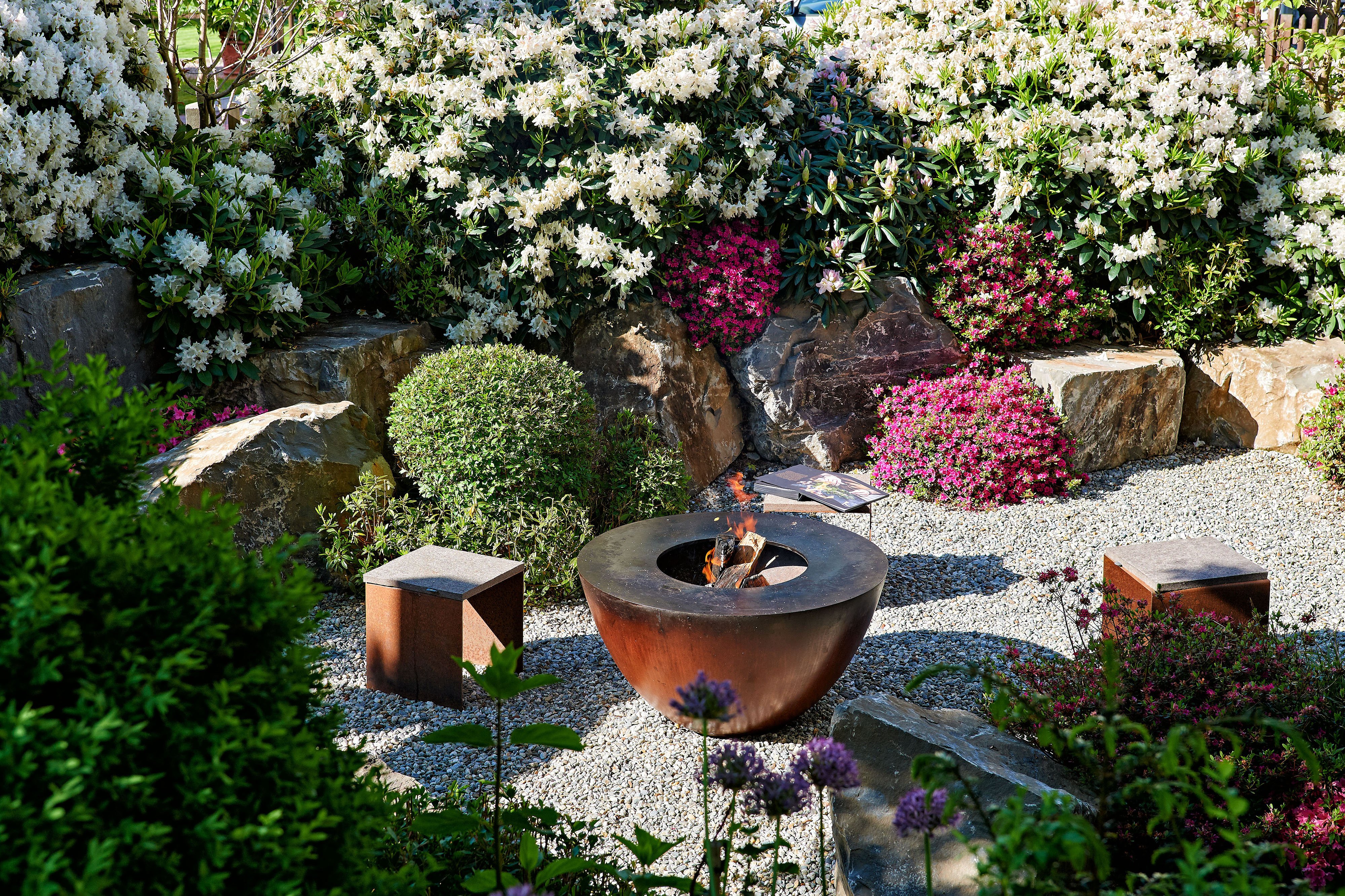 Direkt vor dem Atelier liegt etwas abgesenkt der neuste Gartenteil mit Kiesbelag und Feuerschale. Entstanden ist ein besinnlicher Ort, an dem die Familie gerne zusammensitzt. Er ist eingefasst von einer Felslandschaft aus Kalkstein, die ein harmonisches und zugleich spannungsvolles Bild erzeugt. Zwischen den Steinen, die ein variierendes Farbspiel von hellgrau bis ocker aufweisen, wachsen Rhododendren, begleitet von Japanische Azaleen, dazu ein Cornus florida und Magnolien. Im Herbst setzen Prachtglocken (Enkianthus) feurigrote Akzente.